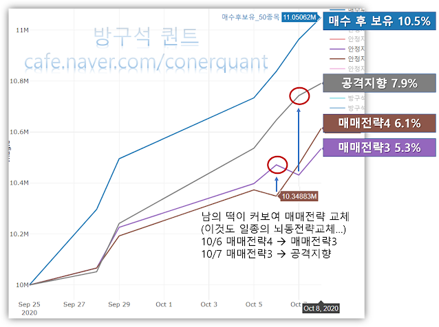 그렇게 화가 나있는 중에 매수후보유의 수익과 차이가 너무 많이 나서 예전에 개발했던 공격지향 전략을 백테스트 해보니... 제길! 훨씬 높은 수익을 보이고 있었습니다. 그래서 10월7일에 또 종목을 대거 교체하면서 공격지향전략으로 갈아탑니다. 그렇게 뇌동매매와 같은 뇌동매매전략 교체의 결과는 어떠할까요?